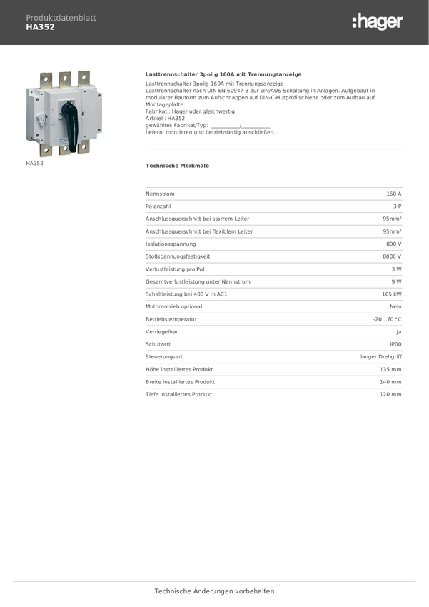 HA352 Hager HA352 Przełącznik rozłączający 3 styki 160 A 415 V