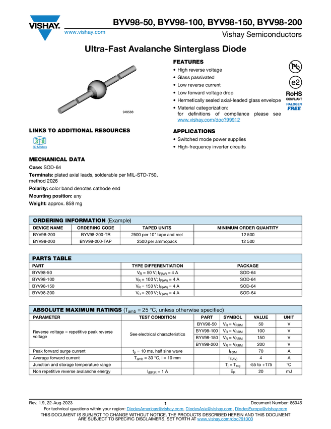 BYV98-50 Ultra-Fast Avalanche Sinterglass Diode