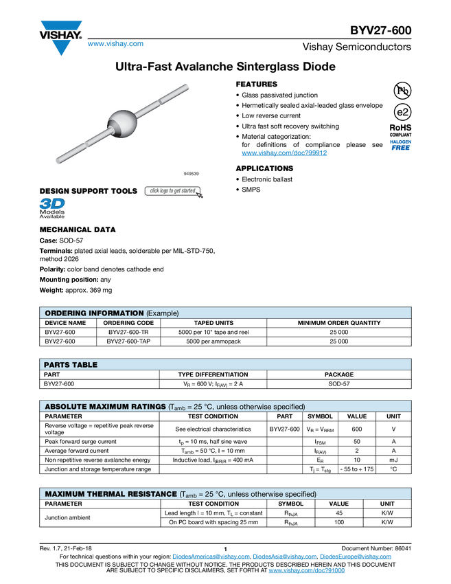 BYV27-600 Ultra-Fast Avalanche Sinterglass Diode