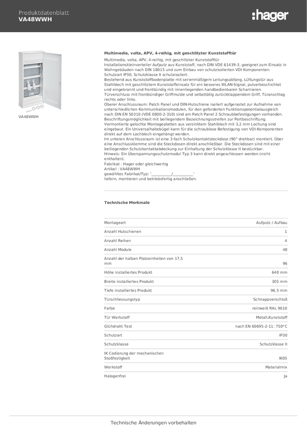 VA48WWH Rozdzielacz multimedialny Hager VA48WWH, 305 mm x 640 mm , 1 szt.