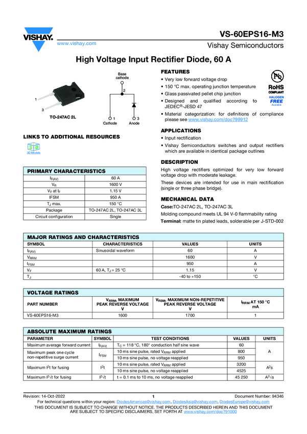 VS-60EPS16-M3 High Voltage Input Rectifier Diode, 60 A
