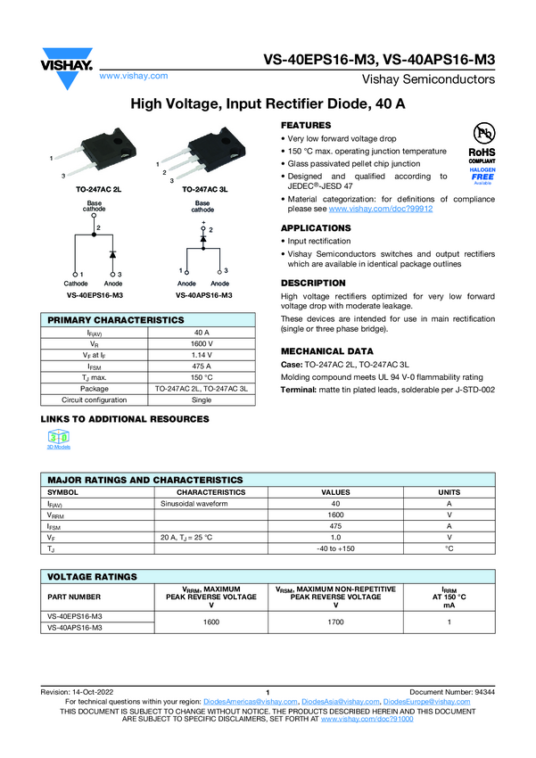 VS-40EPS16-M3 High Voltage, Input Rectifier Diode, 40 A