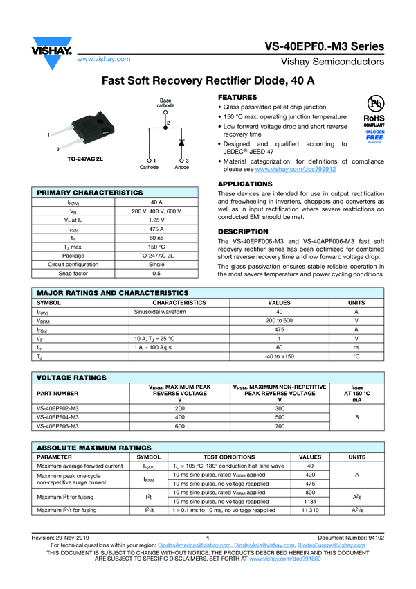 VS-40EPF0.-M3 Series Fast Soft Recovery Rectifier Diode, 40 A