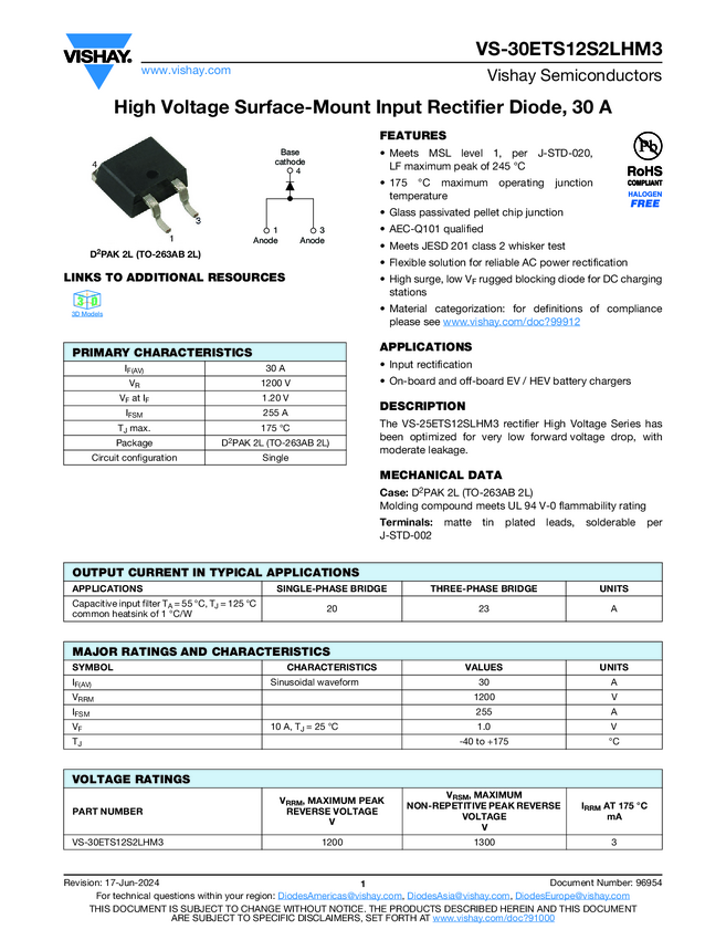 VS-30ETS12S2LHM3 High Voltage Surface-Mount Input Rectifier Diode, 30 A