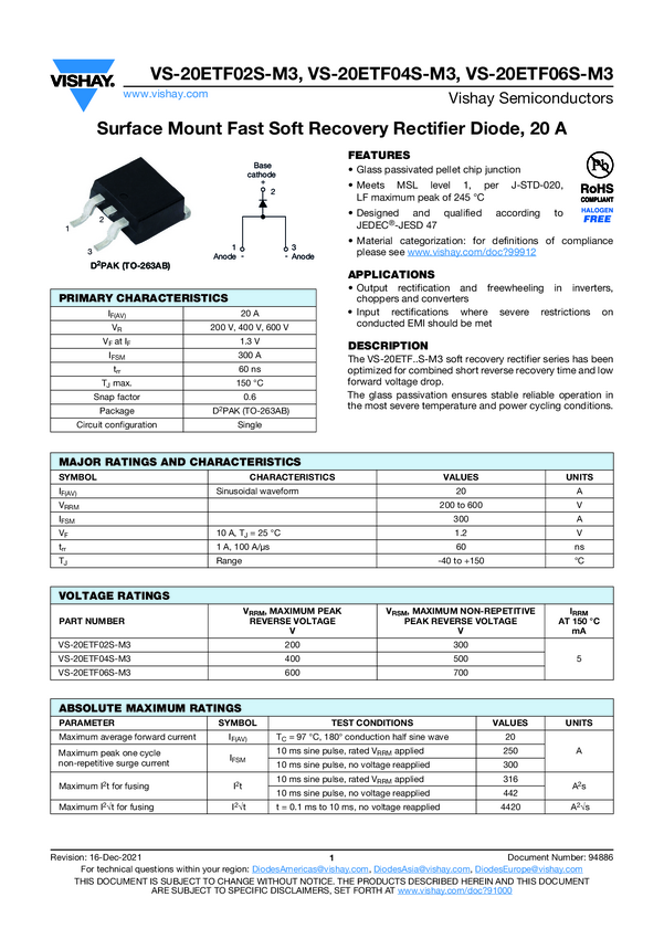 VS-20ETF02S-M3 Surface Mount Fast Soft Recovery Rectifier Diode, 20 A