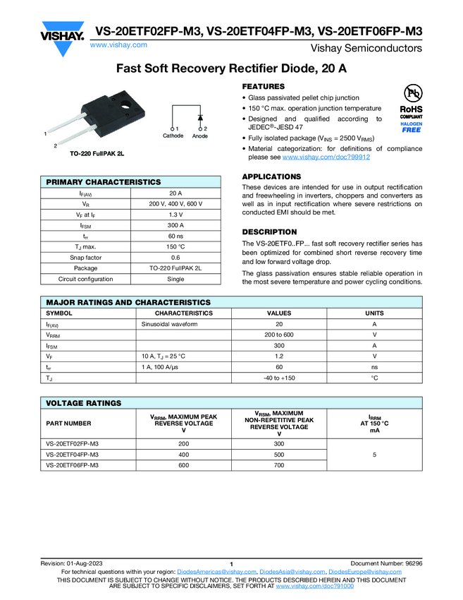 VS-20ETF02FP-M3 Fast Soft Recovery Rectifier Diode, 20 A