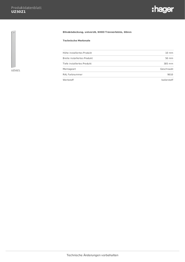 UZ50Z1 Hager UZ50Z1 Niewidoczna osłona biały 1 szt.