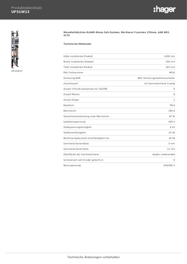 UF51W13 Pole konwertera Hager UF51W13, 250 mm x 1400 mm , 1 szt.