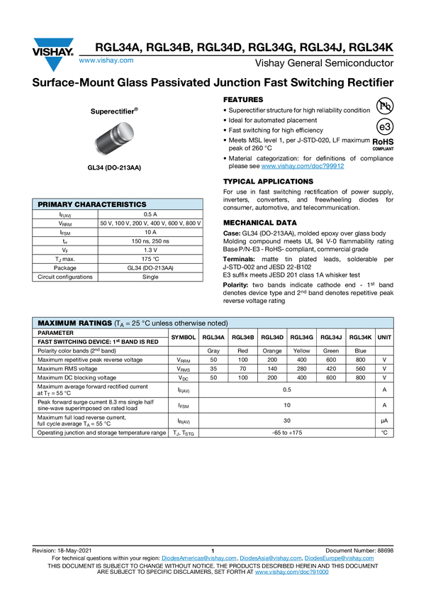 RGL34K Surface-Mount Glass Passivated Junction Fast Switching Rectifier