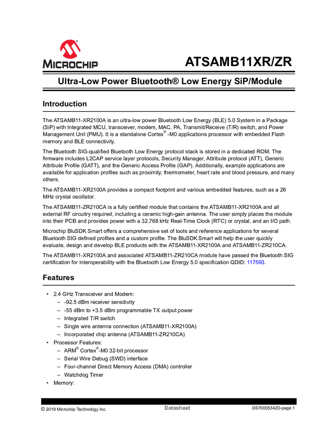 ATSAMB11XR/ZR Ultra-Low Power Bluetooth Low Energy SiP/Module