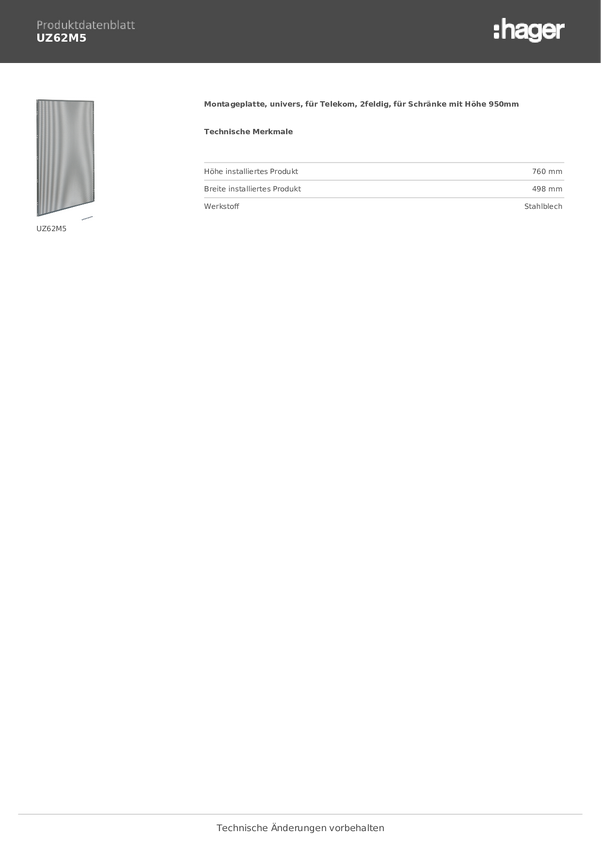 UZ62M5 Hager UZ62M5 Płyta montażowa stal 1 szt.