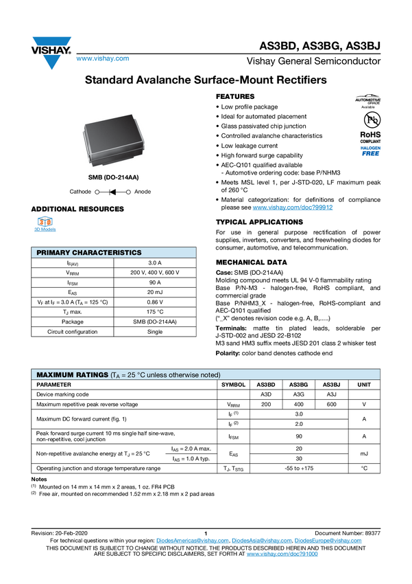 AS3BJ Standard Avalanche Surface-Mount Rectifiers