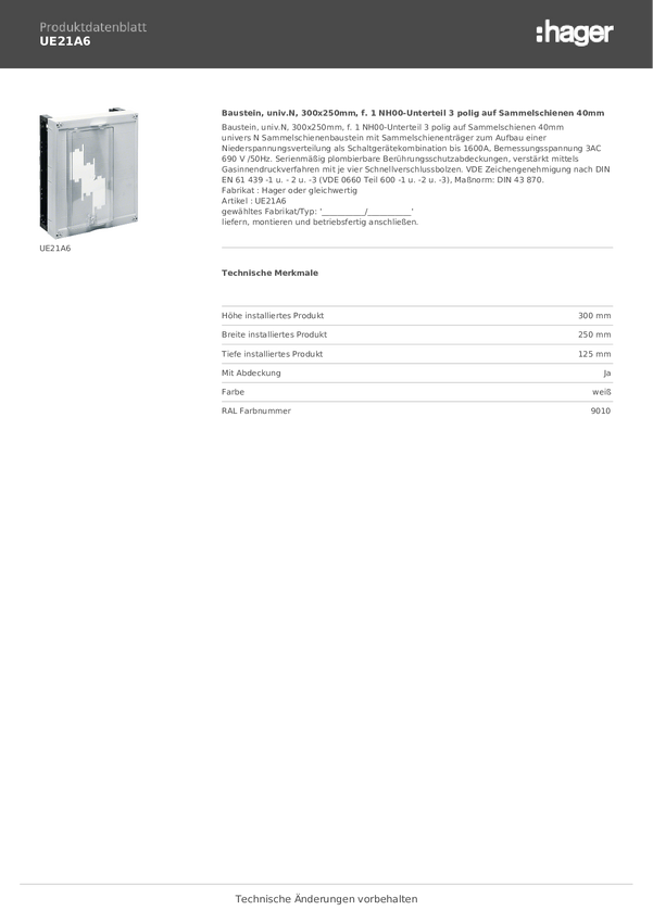 UE21A6 Hager UE21A6 Moduł czysty biały (ral 9010) 3 styki 355 A 1 szt.