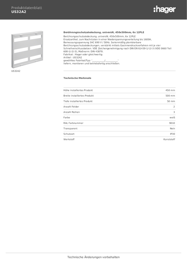 US32A2 Hager US32A2 Osłona ochronna styków tworzywo sztuczne biały 1 szt.