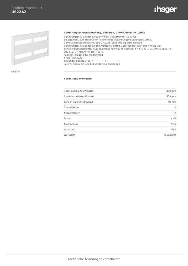 US22A2 Hager US22A2 Osłona ochronna styków tworzywo sztuczne biały 1 szt.