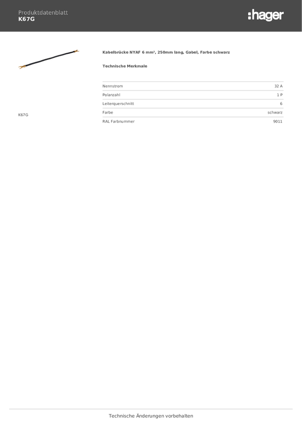 Hager K67G Mostek kablowy 1 styk 6 mm² 1 szt.