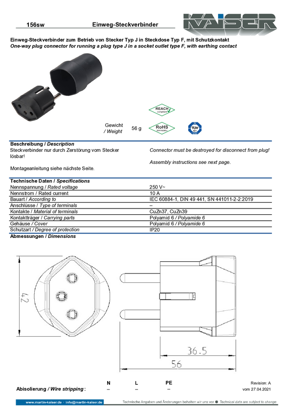 156/sw/1 Adapter podróżny Martin Kaiser 156/sw/1 Zestaw 1 szt.