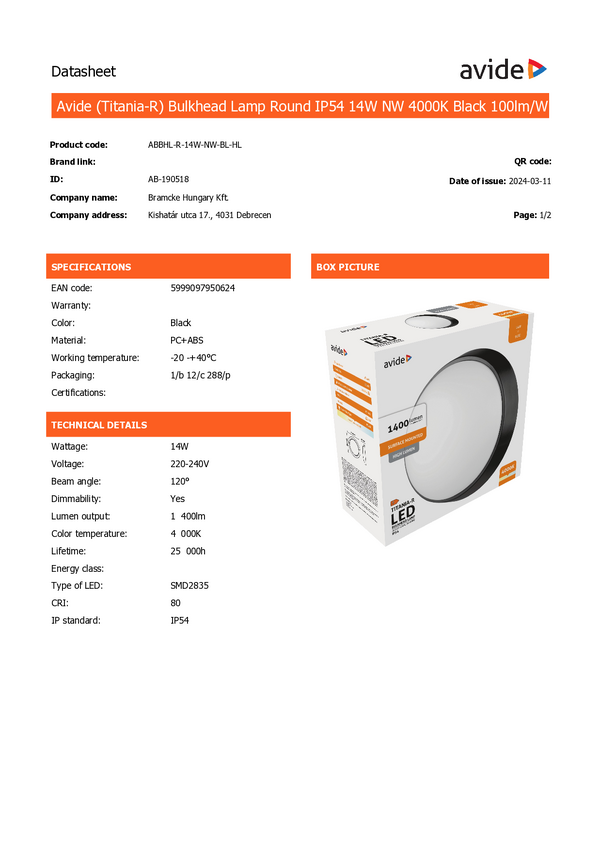 ABBHL-R-14W-NW-BL-HL Zewnętrzna lampa ścienna avide Titania-R ABBHL-R-14W-NW-BL-HL 14 W czarny