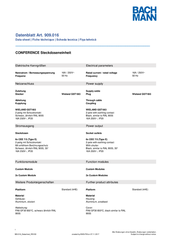 909016 Listwa zasilająca Bachmann 909016 909016 Ilość gniazdek: 6