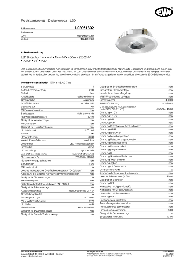 Oświetlenie wewnętrzne LED EVN L23061302 L23061302 6 W 480 lm