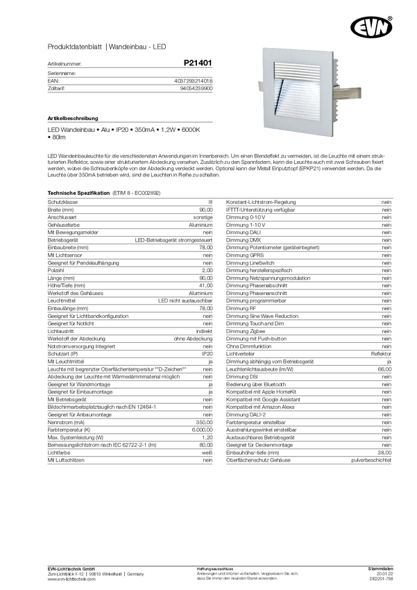 P21401 Lampa ścienna do zabudowy LED EVN P21401 P21401 aluminiowy