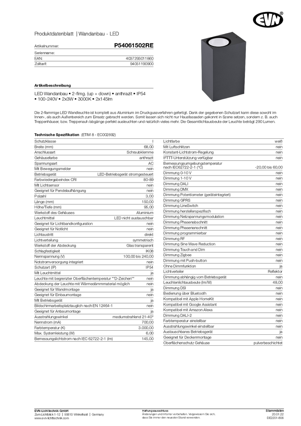 Zewnętrzna lampa ścienna EVN P54061502RE P54061502RE IP54