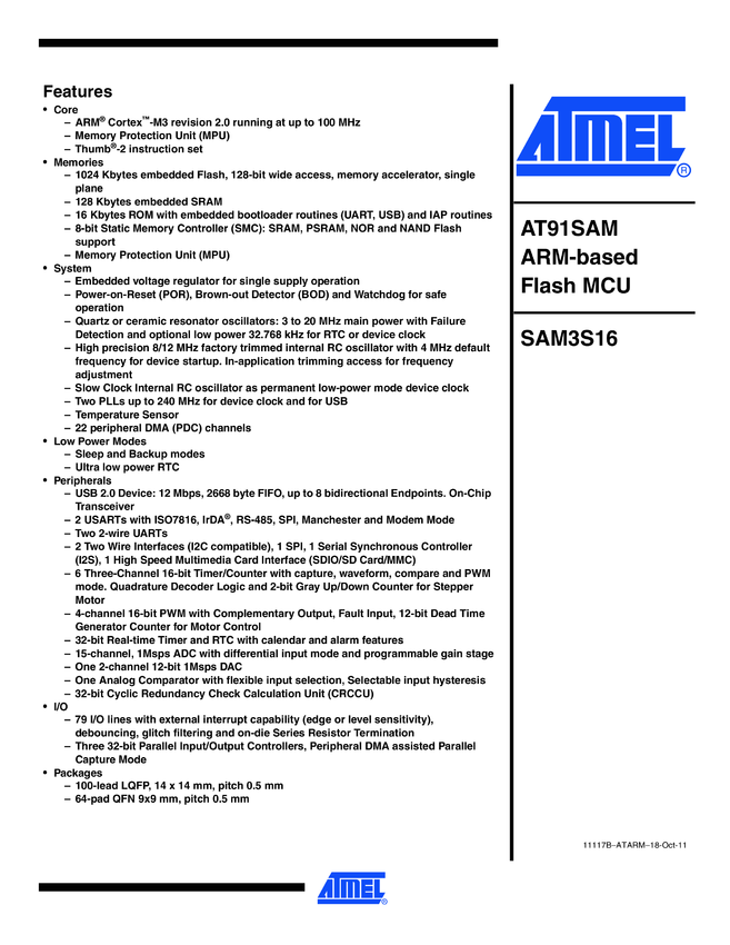 ATSAM3S16C Cortex-M3 Microcontroller with 1MB Flash, 128KB SRAM, USB, 100 Pins