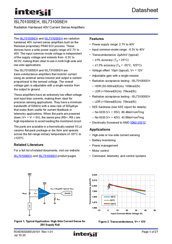 ISL70100SEHX/SAMPLE Radiation Hardened 40V High and Low-Side Current Sense Amplifier