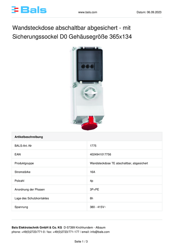 1775 Gniazdo naścienne CEE Bals Elektrotechnik 1775 16.0 A 400 V