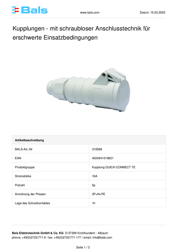 310068 Łacznik CEE Bals Elektrotechnik 310068 16.0 A 50 V