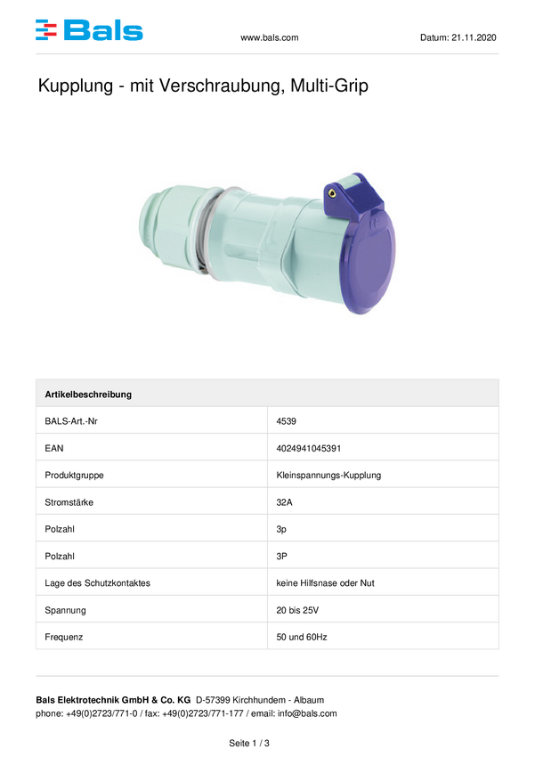 4539 Łacznik CEE Bals Elektrotechnik 4539 32.0 A