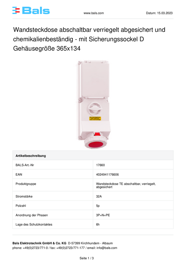 17660 Gniazdo naścienne CEE Bals Elektrotechnik 17660 32.0 A 400 V