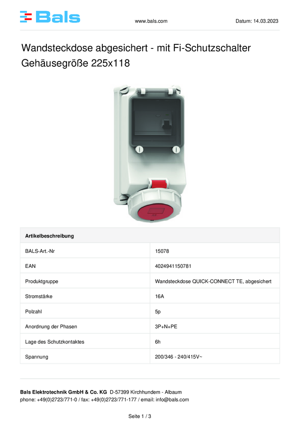 15078 Gniazdo naścienne CEE Bals Elektrotechnik 15078 16.0 A 400 V