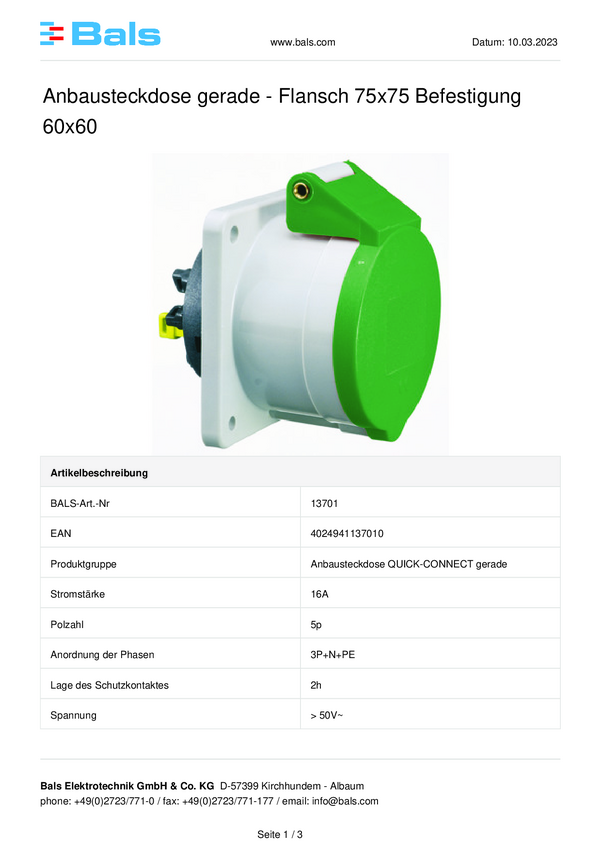 Puszka montażowa CEE Bals Elektrotechnik 13701 16.0 A 500 V