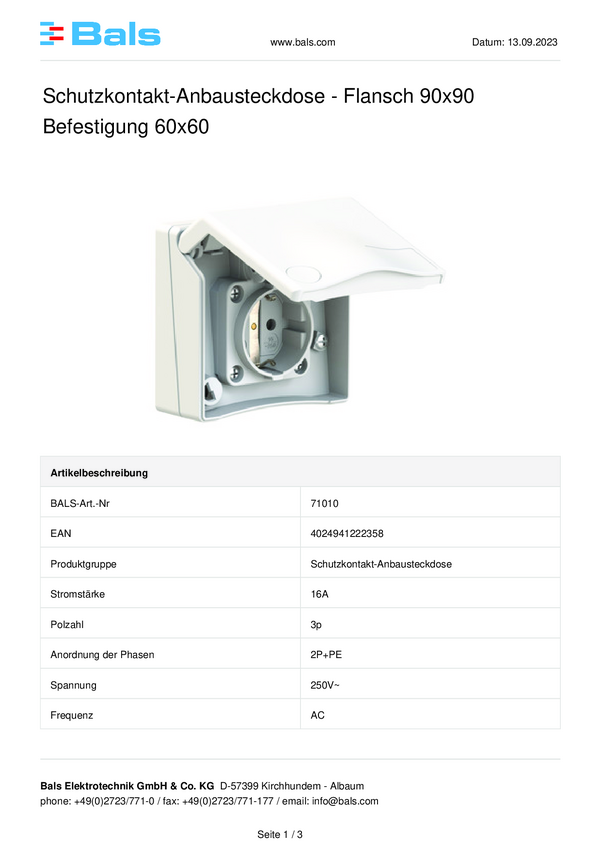 71010 Bals Elektrotechnik 71010 Gniazdo zmontowane IP44