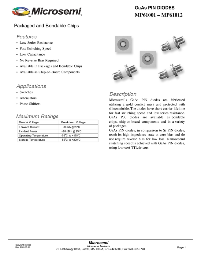 MP61000-GaAs-PIN GaAs PIN Diodes MP61001 - MP61012