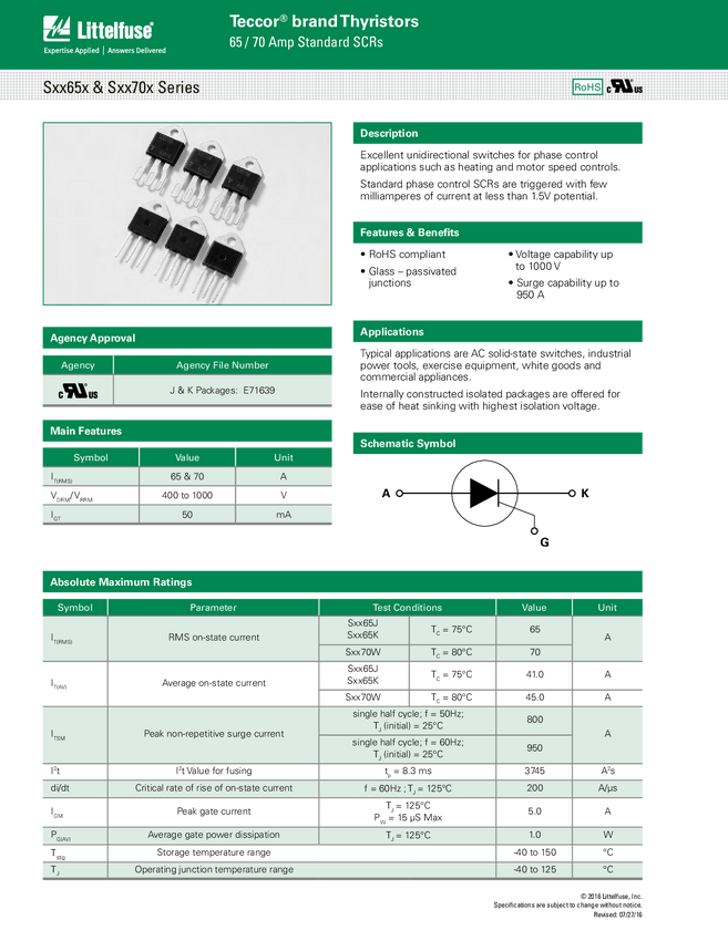 Tyrystor; S8065KTP; 65A; 800V; 50mA; TO218AC; THT; LITTELFUSE; RoHS