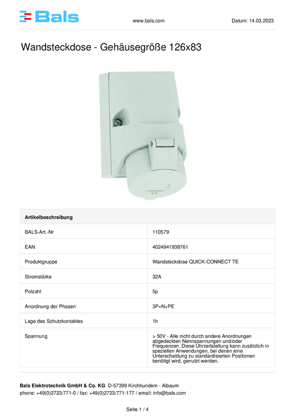 110579 Gniazdo naścienne CEE Bals Elektrotechnik 110579 32.0 A 50 V