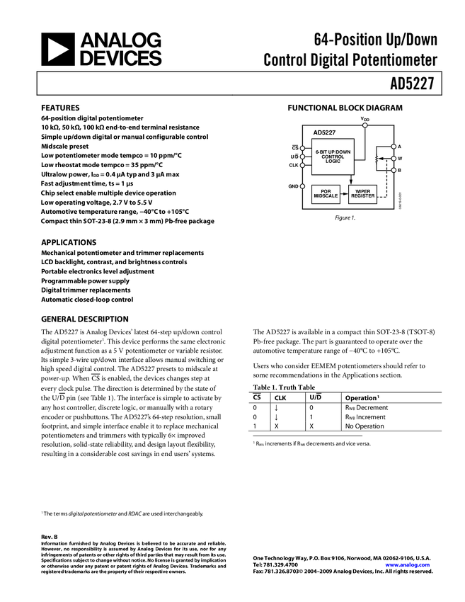AD5227 64-Position Digital Up/Down Control Potentiometer