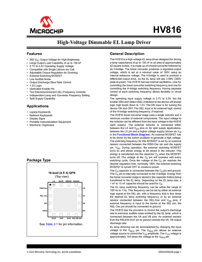 HV816 High-Voltage Dimmable EL Lamp Driver Data Sheet