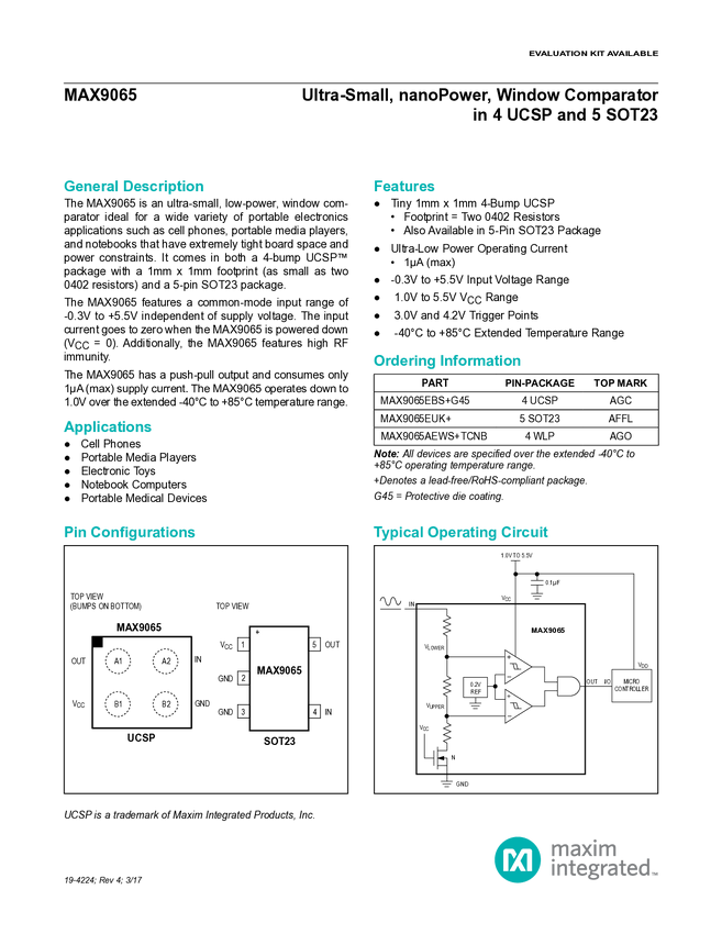 Ultra-Small, nanoPower, Window Comparator in 4 UCSP and 5 SOT23