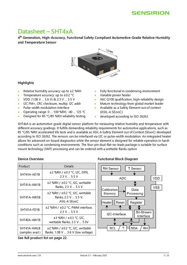 SHT40A-AD1B - ±3% humidity sensor for automotive applications / I2C interface