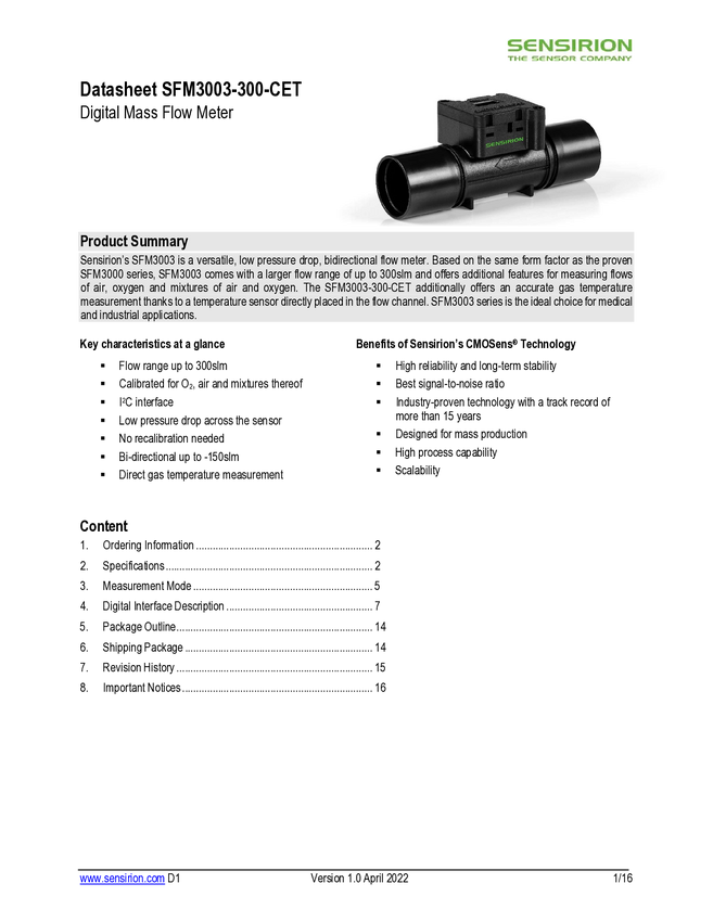 SFM3003-300-CET Versatile digital flow and temperature sensor, -150 to +300 slm
