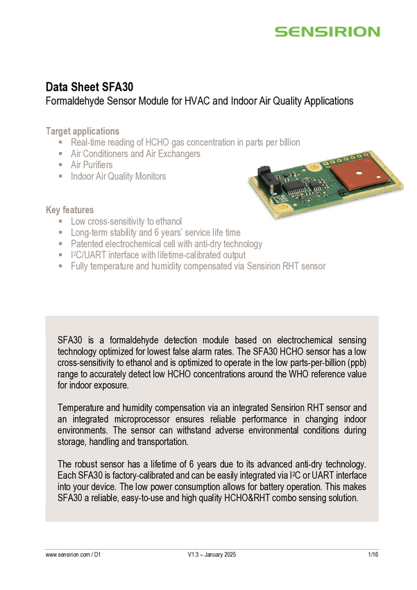 SFA30 - Formaldehyde sensor with ultra low cross-sensitivity to ethanol