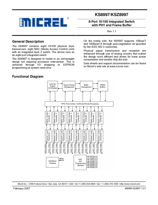 KS8997/KSZ8997 - 8-Port 10/100 Integrated Switch with PHY and Frame Buffer