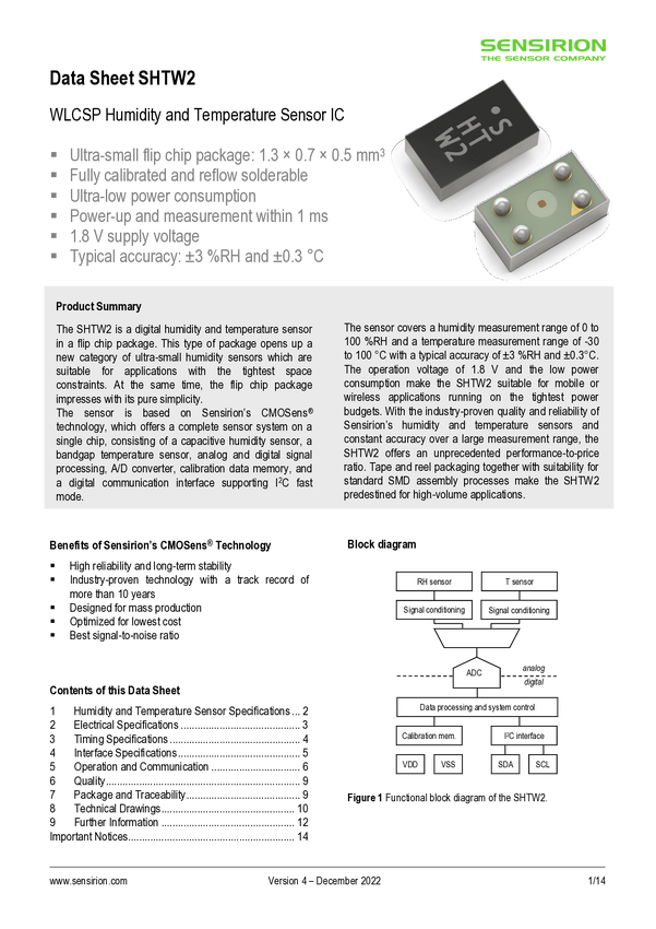 SHTW2 - ±3% Digital humidity and temperature sensor in WCSP