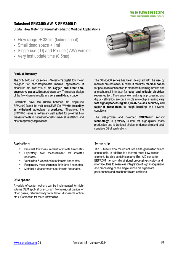 SFM3400-D - Proximal flow sensor for neonatal applications, single-use, 33 slm