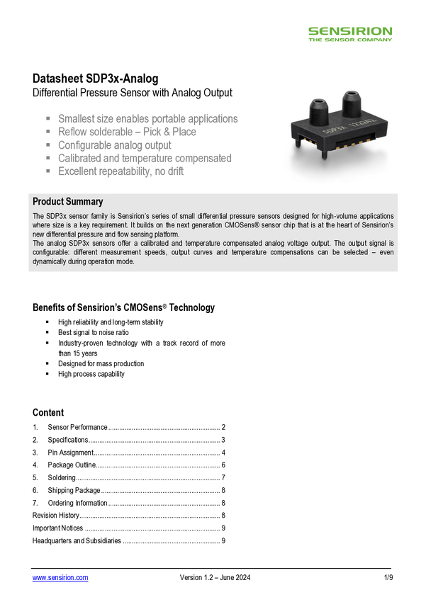 SDP36 - Analog differential pressure sensor (±500 Pa)