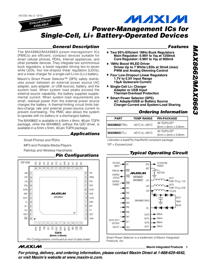 MAX8662 Power-Management ICs for Single-Cell, Li+ Battery-Operated Devices