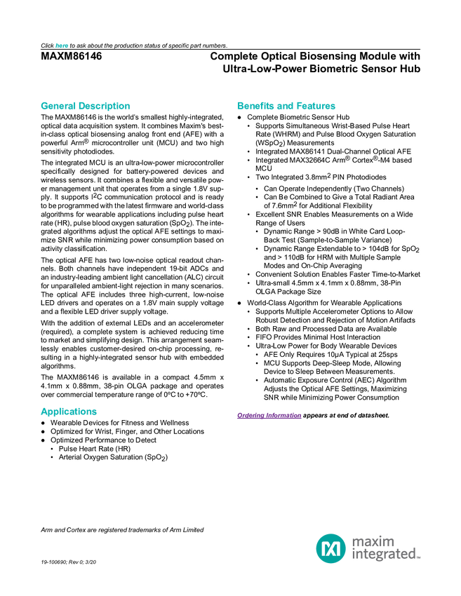 MAXM86146 Complete Optical Biosensing Module with Ultra-Low-Power Biometric Sensor Hu...